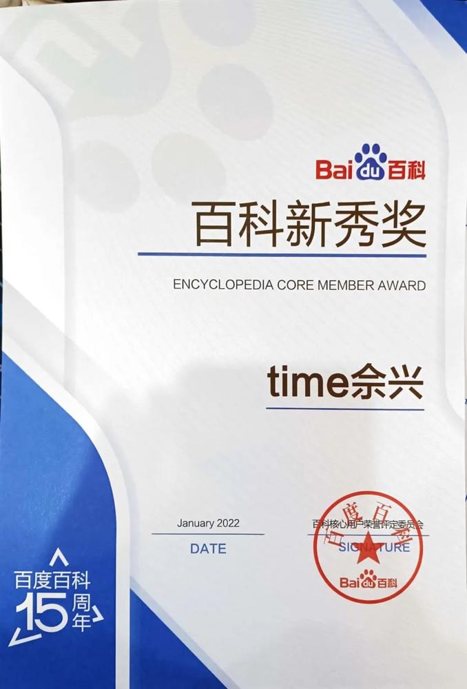 2021年末,获得百度百科荣誉年度贡献奖“百科新秀奖”,其颁奖词是“time佘兴于2021年加入蝌蚪团,成长迅速,在普通评审方面位居前列,积极活跃于蝌蚪团、评审团、达人团、百科校园和热词团等团队,在百忙中编审词条,还带领不少同学为百科添砖加瓦,把编辑词条当作一份爱好,非常难得!”
