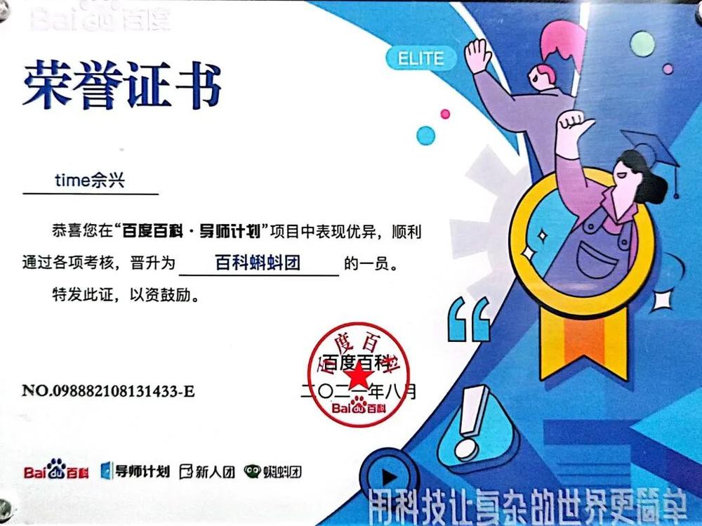 2021年,我加入了百度百科校园团队。其百度百科夏令营最吸引我关注。在一年时间里,我在百度百科团队成为了蝌蚪团成员、评审团成员、热词团成员、达人团成员、求知组副团长、所在学校的校园大使、西部区宣传官。